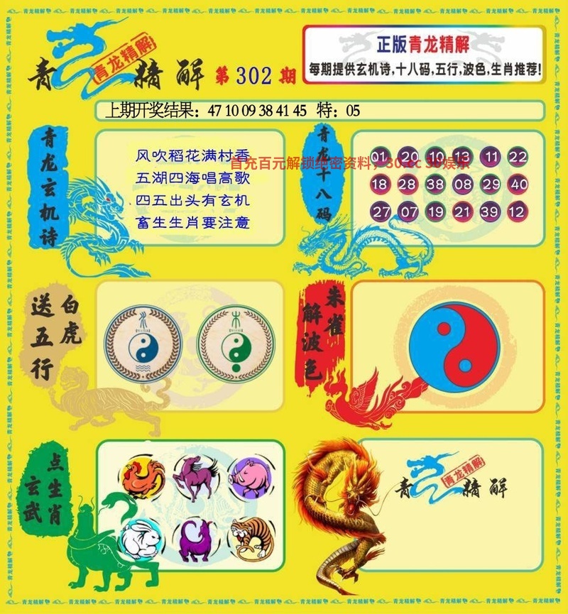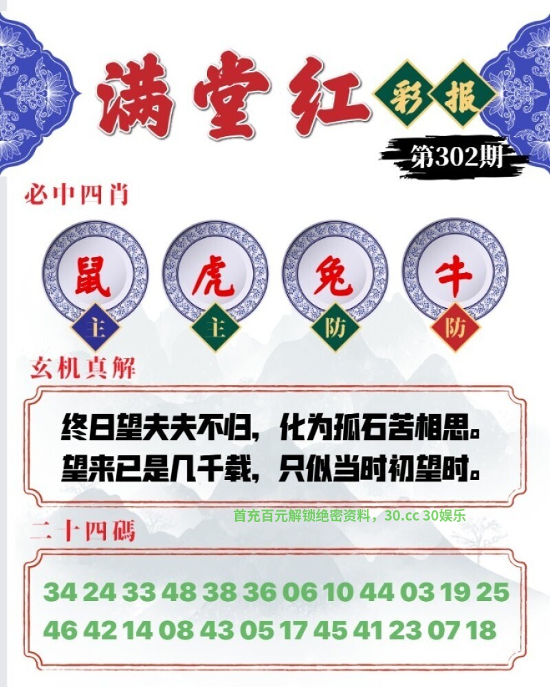 303期满堂红彩报:岁岁金河复玉关,朝朝马策与刀环。三春白雪归青冢,万里黄河绕黑山。 六肖:鼠龙虎兔马鸡 |