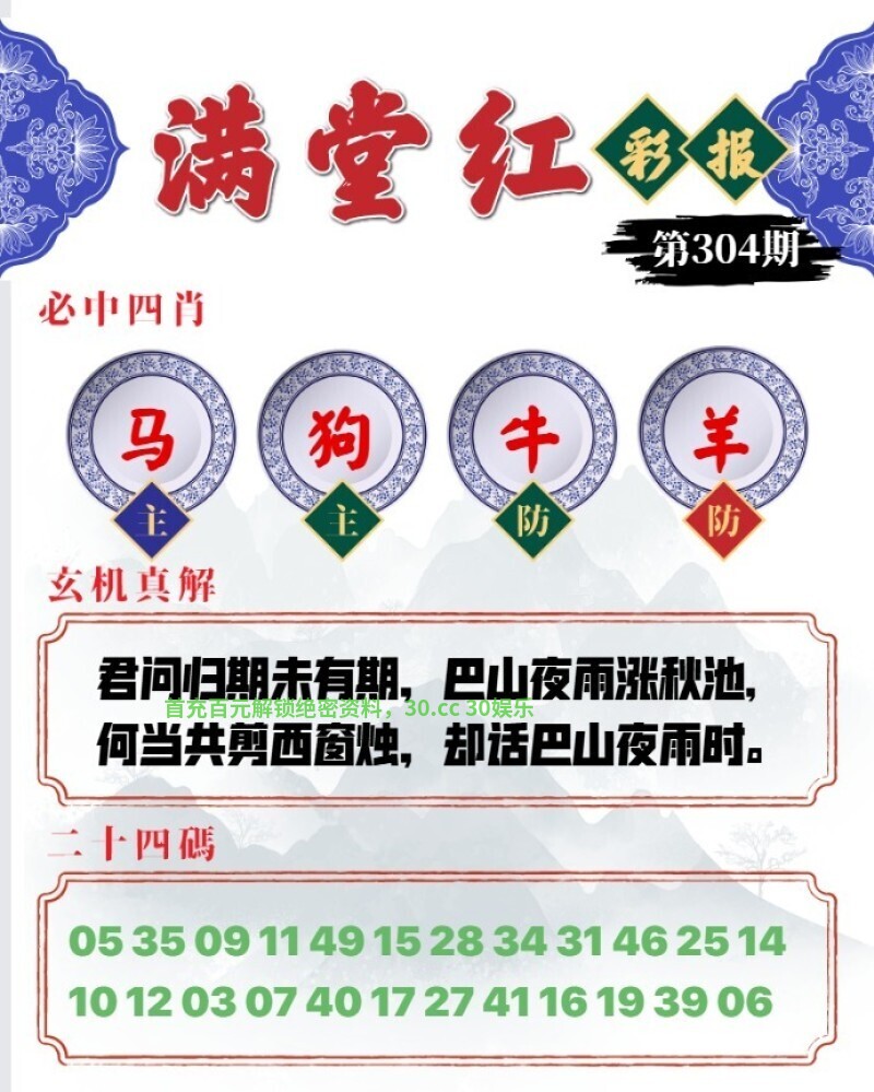 304期满堂红彩报:君问归期未有期,巴山夜雨涨秋池。何当共剪西窗烛,却话巴山夜雨时。 六肖:猪鸡马羊蛇鼠 三肖:猪鸡马 |